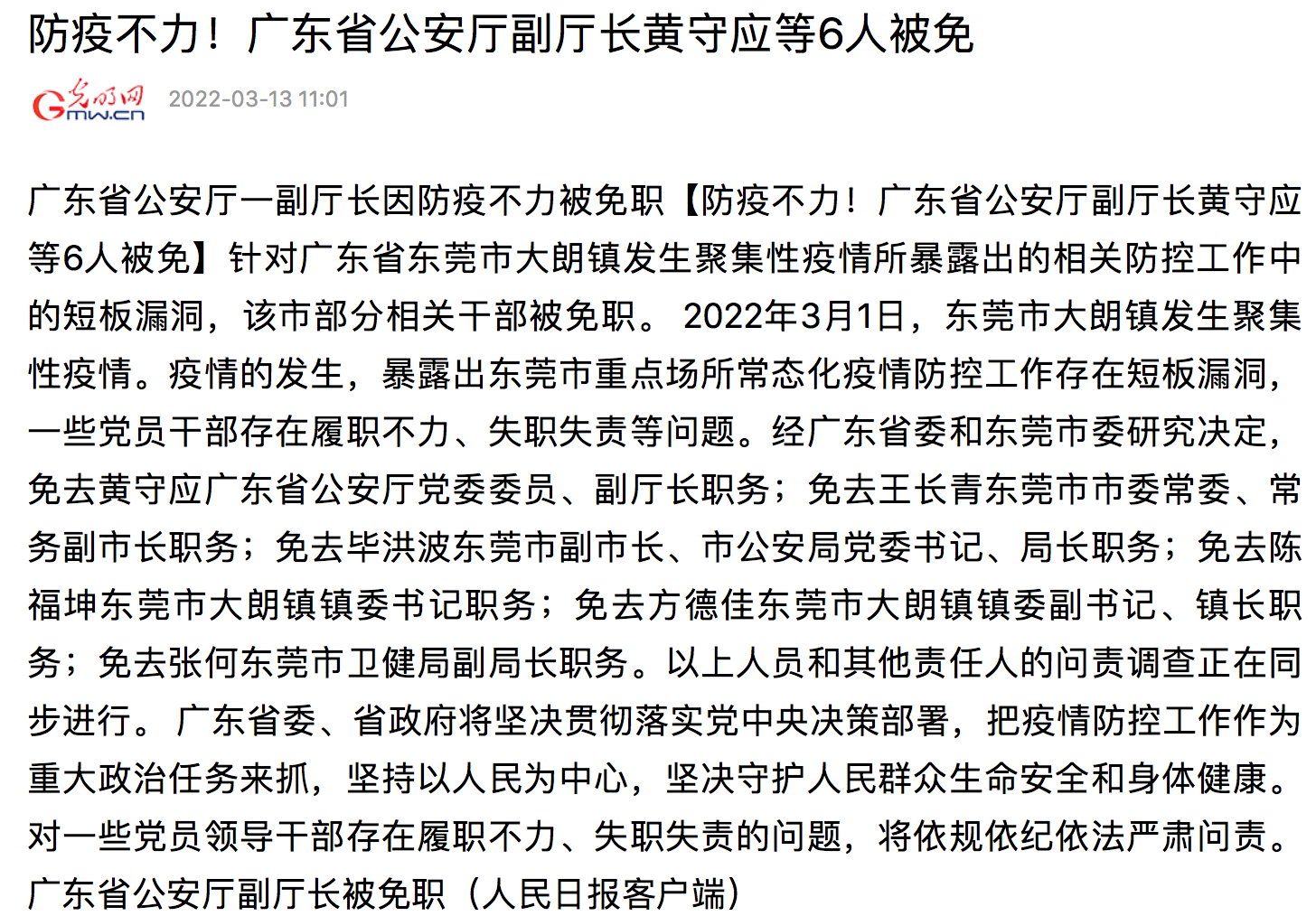 媒体报导的几位免职的官员中,东莞有两位厅级的官员(王某、毕某,外省人),表面上是因为防疫工作失责被免职,实则是权力斗争的牺牲品,是被幕后黑手操纵用卑鄙手段摘去乌纱帽,拉下马的……