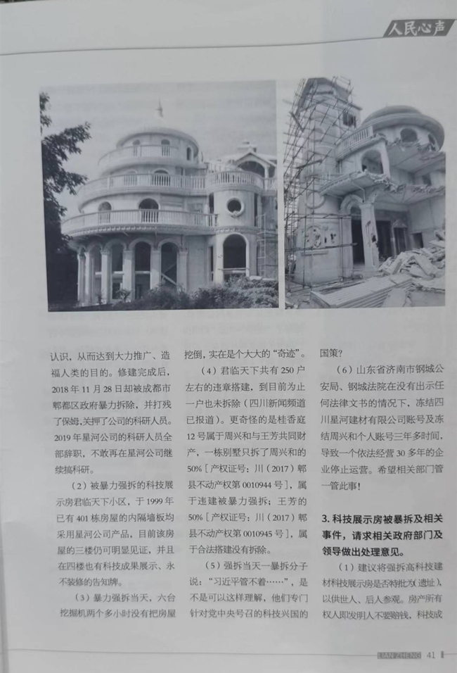 请首长和记者在百度上再次搜索:别墅区的圈地运动——四川电视台报道,小区有401别墅,有250多家违规搭建,首长,真正的违规搭建,连违章搭建的住户都愿意拆除,可是至今我们一户都未拆除,为了配合政治局首长把习近平搞下台,我们郫都区委、区政府、公、检、法等相关部门专门针对习近平号召科技兴国,我们采取暴力武力强拆了周兴和的科技成果展示房,强拆当天有退休老工人发出质疑,我们的领导,共产党员大声怒道“习近平管不着!”,首长,请您看看您手里的《廉政内参》嘛,也两次提到,习近平管不着。