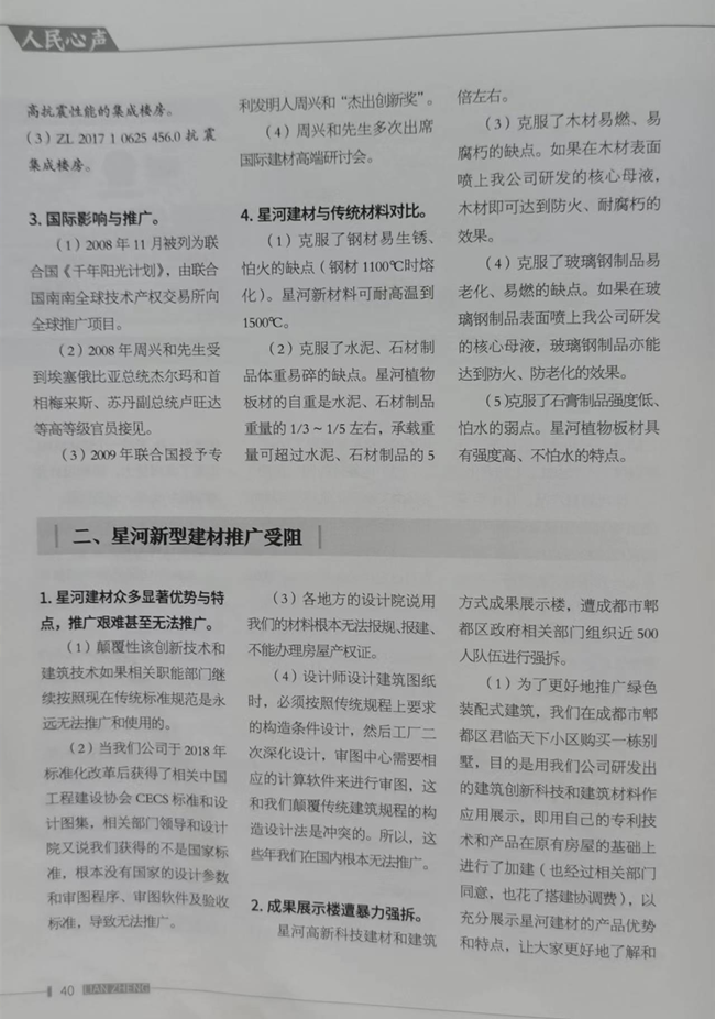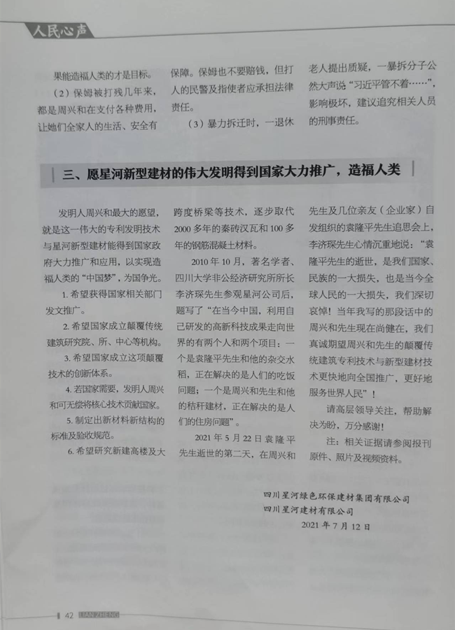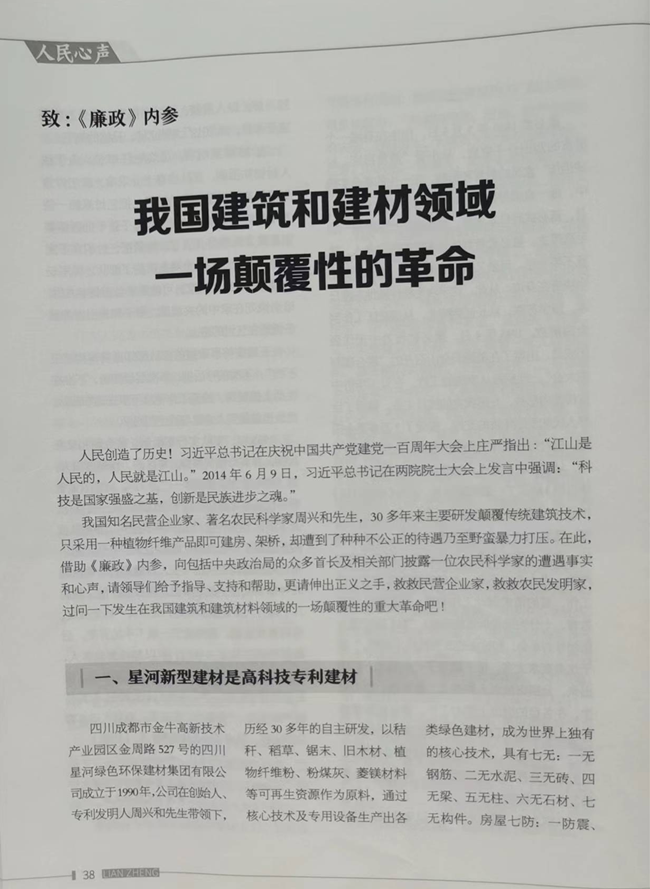 政治局首长回到住所,不紧不慢地从公文包里掏出来一本《廉政内参》说道,大家知道这本《廉政内参》是什么背景吗?是中共元老董必武的孙娃子,耿飙的女娃子办的。耿飙!你们不知道是谁吗?习近平跟着他当过秘书的,死了骨头都是习近平捡的,大家做事要警惕要小心。你知道这本《廉政内参》2021年9月5日,第四期登了什么吗?《廉政》内参第38页,人民心声:“我国建筑和建材领域一场颠覆性的革命”,开篇就说到你们郫都区野蛮暴力打压,请求中央政治局众多首长,伸出正义之手,救救农民企业家,救救农民发明家。一年多时间过去了,又有谁去救他周兴和呢?首长继续说,网传周兴和2019年6月1日晚,在君临天下银杏居12号家庭遭暗杀,报案后,小区监控都被屏蔽了,这事是不是你们郫都区公安干的呀?