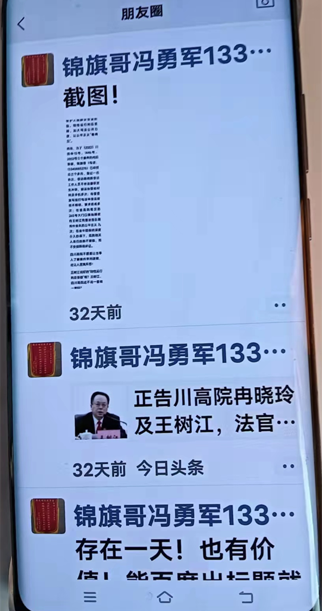 我认为这样不但打击了习的“科技兴国”战略,对其“依法治国”也是致命一击,还为组织筹得可观的经费,一举三得。王树江院长很得意地笑,话没说完,就遭到北京首长善意地批评:“这个时候,大家不要搞得太激烈,容易反弹,钱的事不用你们下面筹,我们钱丰富得很,习害怕的就是我们团队有钱,不要为了钱让我们损兵折将了,不要向我们的战友沈德咏一样,临大战了,折了!”,“任欣欣、冯勇军是怎么回事?”。王树江院长收起得意的表情,毕恭毕敬的给北京首长解释道,任欣欣的案子,冯勇军为了判后释明,就在四川省高院门口摆地摊数十次,长达几个月时间,当然,我也只有故意躲着他,那个锦旗哥冯勇军就在网上诽谤我跟审判长冉晓玲有暧昧关系...记者打断王院长好奇地问:“王院长,你到底与冉美女有没有暧昧呢?”。王树江笑而不答。继续回首长的话:“冯勇军这个刺头,太气人了,他那什么铁杆粉丝周某某,还说冉晓玲是我多年的情妇,我王树江在法院系统有43名女法官有不正当关系,真放肆”。停了停,王院长继续说:“冯勇军还赢了郫都区22件行政官司,8月19日,冯又到我高院门口寻衅滋事,我让郫都区公安局的同仁把他抓了,关在精神病院里”。北京首长肯定地说:“做得很好!”