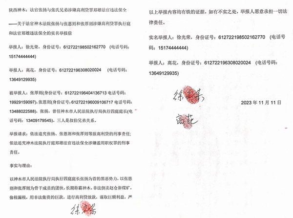 举报请求:依法追究张扬、张恩则和张厚则等放高利贷的刑事责任;依法追究神木法院执行庭郑雄法官违法保全涉嫌滥用职权罪的刑事责任。