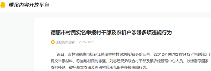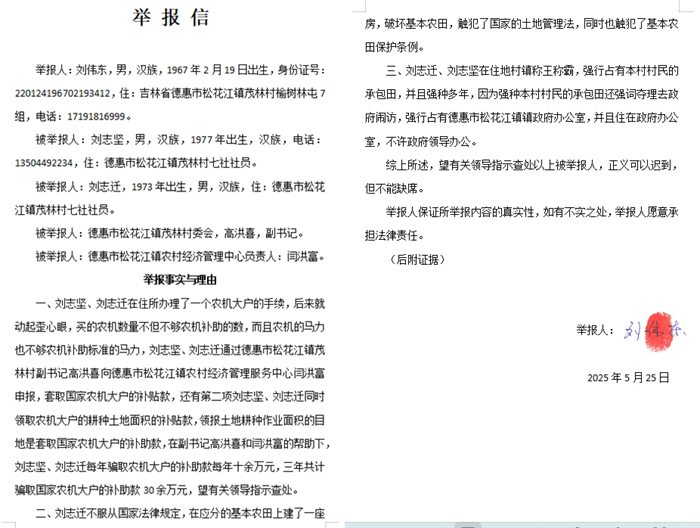 近日,吉林省德惠市松花江镇茂林村村民刘伟东(身份证号:220124196702193412)向相关部门提交举报材料,称当地村民刘志坚、刘志迁兄弟联合村干部及镇农经管理中心人员,涉嫌套取国家农机补贴、破坏基本农田及强占村民承包田等多项违规行为。