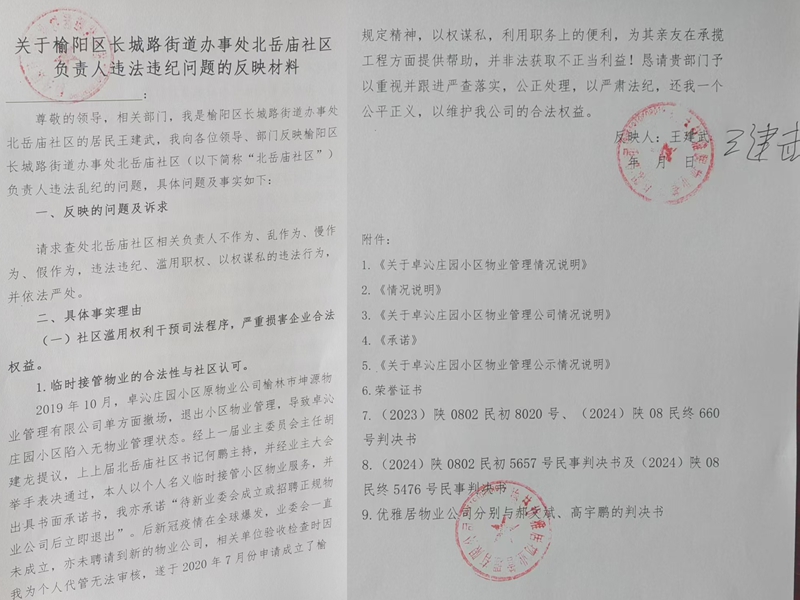 多次催收无果后,迫于无奈,我公司只能通过法律途径维护自己的合法权益。诉讼期间,北岳庙社区于2023年6月21日向法院出具《关于卓沁庄园小区物业管理公司的情况说明》,明确载明:“榆林优雅居物业管理有限公司自2020年7月起实际服务管理卓沁庄园小区。”然而,2023年8月22日,社区突然另行出具一份《说明》,声称此前文件“不作为起诉、开庭审理使用”。该行为直接导致法院难以认定事实,部分业主借此拒缴费用,恶意拖欠行为进一步蔓延。在我公司向法院诉请业主支付物业费的案件中,业主不认可我们的物业服务,拒绝向我公司缴纳物业费,法院亦认为我们之间不存在物业服务关系,业主据此不缴纳物业费(详见附件(2023)陕0802民初8020号、(2024)陕08民终660号判决书)。在业主诉请物业公司因不清扫楼门口积雪致使业主滑倒受伤请求承担违反安全保证义务的赔偿金时,法院又认定我公司和业主之间存在物业服务关系,判决我公司支付医疗费(详见(2024)陕0802民初5657号民事判决书及(2024)陕08民终5476号民事判决书)。正是由于社区负责人滥用权力出具自相矛盾的证明文件,导致法院对事实无法认定,严重干扰司法程序,涉嫌包庇违法欠费行为,我公司为了为小区提供物业服务,聘请第三方对电梯进行维保、聘请保洁、保安对小区进行维护,自己垫付大量金钱,但现在面临大量业主因社区不作为、乱作为拒不缴纳物业费,一方面不认可我们的物业服务,一方面又让我公司承担赔偿责任,对此,社区自始至终无视我公司的现状,反而助长部分业主不缴纳物业费的气焰,其行为对我公司的维权造成了极大的阻力,致使我公司的合法权益受损,其滥用职权的行为应当被查处,并依法严惩。