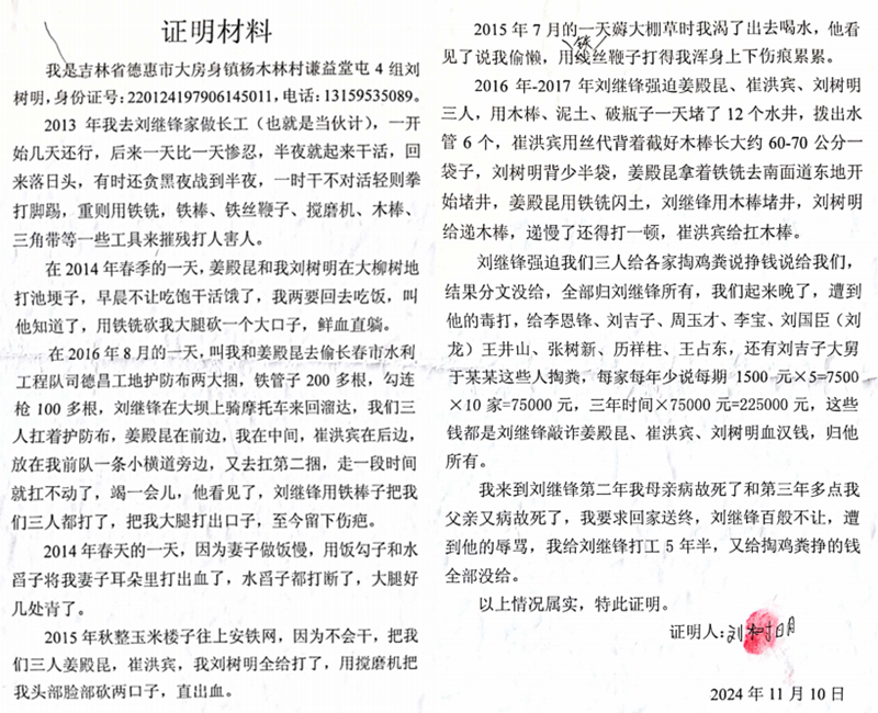 在被包庇的罪行中,强迫劳动与故意伤害尤为恶劣。刘继锋长期绑架控制智障人士姜殿坤(长达19年)、崔洪宾(3年)、刘树明(5年),强迫三人从事体力劳动,动辄以木棍、电棍等工具殴打,致三人身上伤痕累累,更残忍的是竟然禁止刘树明为母亲送终!2020年7月,刘继锋因水井纠纷用镰刀把打伤村民王景凤,导致其左耳失聪,现场三名证人明确指证,但徐永庆、刘继平却以"无证人"为由拒不受理报案。