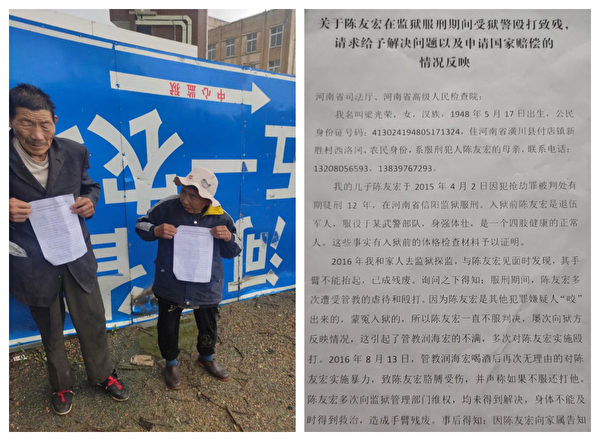 河南信阳退伍军人陈友宏在狱中被打断胳膊,家人多次维权无果。(网路截图)