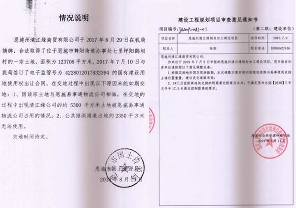 公开资料显示,湖北省恩施州清江缘商贸有限公司(以下简称清江缘公司)成立于2013年5月,其钢材加工及市场建设项目是恩施市人民政府招商引资项目,并办理了合法的相关备案手续,2017年缴纳了4454万元土地出让金(约185亩)取得土地手续。然而在接收恩施市国土局交付出让土地时,该公司却发现交付地块中有部分土地已被恩施易事通汽车运输有限责任公司(以下简称易事通公司)非法占用数年,并已经建成厂房。 清江缘公司多次向恩施市国土部门反映无果,以至于在项目土地平整中多次与易事通公司发生冲突和阻工,并且多次报批厂房建设规划手续时受阻,被恩施自然资源和规划局(下称市资源局)告知因现场踏勘地块内与易事通公司建筑物(非法占地建筑物)重叠无法审批,该问题拖而不决。前期建设项目已投入资金逾2亿元,多名投资人在长达七年的建设审批过程中负债累累,无可奈何,百名员工面临下岗失业。在建设办公楼时,由于恩施市相关部门尤其是资源局滥权妄为、公权私用造成拖欠上千万农民工工资,与清江缘公司相关联的公司也已经举步维艰、濒临倒闭。
