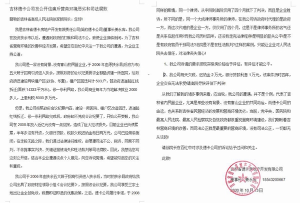 吉林德卡公司发公开信痛斥营商环境恶劣和司法腐败