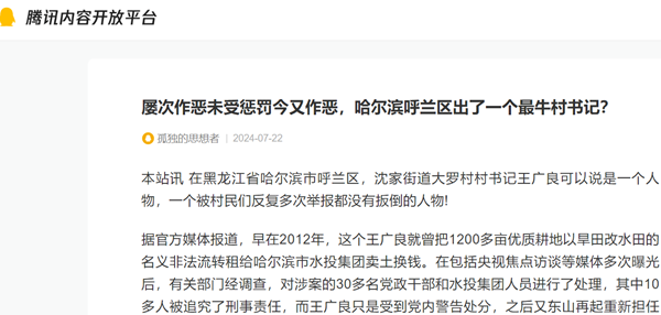 据官方媒体报道,早在2012年,这个王广良就曾把1200多亩优质耕地以旱田改水田的名义非法流转租给哈尔滨市水投集团卖土换钱。在包括央视焦点访谈等媒体多次曝光后,有关部门经调查,对涉案的30多名党政干部和水投集团人员进行了处理,其中10多人被追究了刑事责任,而王广良只是受到党内警告处分,之后又东山再起重新担任村书记。2024年7月1日以后,大罗村村民们再次举报其将5000亩承包地私自改成村集体机动地,将4700多万元补偿款长期扣押。对此,官方回应称,呼兰区纪委已经立案,可是半个月过去了,王广良依然嚣张跋扈如故!人们不禁惊呼,这个村书记到底有什么强大的靠山?难道他不断作恶,就没有人来管了不成?