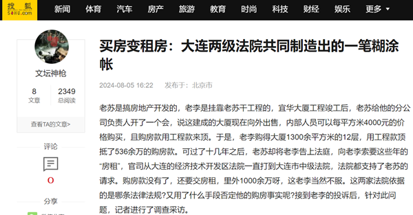 老苏是搞房地产开发的,老李是挂靠老苏干工程的,宜华大厦工程竣工后,老苏给他的分公司负责人开了一个会,说这建成的大厦现在向外出售,内部人员可以每平方米4000元的价格购买,且购房款用工程款来顶。于是,老李购得大厦1300余平方米的12层,用工程款顶抵了536余万的购房款。可过了十几年之后,老苏却将老李告上法庭,向老李索要这些年的“房租”,官司从大连的经济技术开发区法院一直打到大连市中级法院,法院都支持了老苏的请求。购房款没有了,还要交房租,里外1000余万呀,这老李当然不服。这两家法院依据的是哪条法律法规?又用了什么手段否定他的购房事实呢?接到老李的投诉后,针对此问题,记者进行了调查采访。