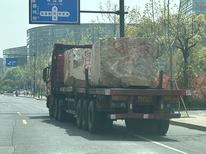 2024年4月1日上午,我们在沈家坞路(龙角路)现场发现有矿石堆场,并有运输矿石的重型卡车出入。
