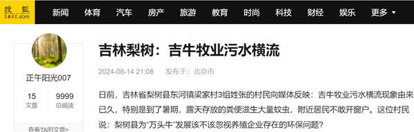 日前,吉林省梨树县东河镇梁家村3组姓张的村民向媒体反映:吉牛牧业污水横流现象由来已久,特别是到了暑期,露天存放的粪便滋生大量蚊虫,附近居民不敢开窗户。这位村民说:梨树县为“万头牛”发展该不该忽视养殖企业存在的环保问题?