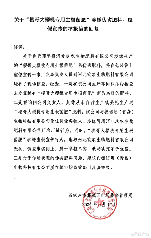 “2023年3月,大连市处置瓦房店樱桃树死亡事件工作专班深入涉事企业瓦房店市殿龙公司,采取查阅销售台账、查验质检报告、抽取样品鉴定等方式,对其2021年1月1日以来销售的23种农药、8种肥料开展调查核实,委托第三方机构对有库存的15种农药进行质量鉴定,对无库存的8种农药和8种肥料追溯生产厂家产品质量检验报告。从检验报告和鉴定结果看,殿龙公司销售的上述农药肥料尚未发现质量问题。”