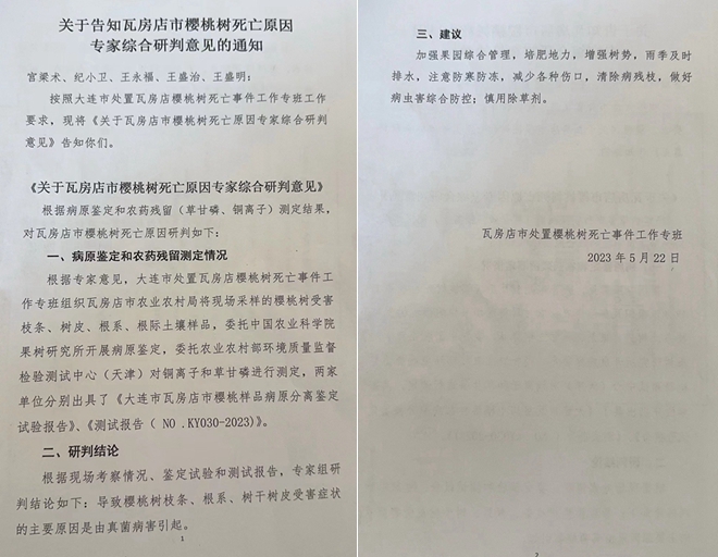 实际上,在2022年11月,瓦房店农业农村局已经组织过一次研判活动,曾参研判的某位专家已经得出樱桃树是死于药害的结论,但是,瓦房店农业农村局未采纳其意见,并将其排除出第二次研判专家组。