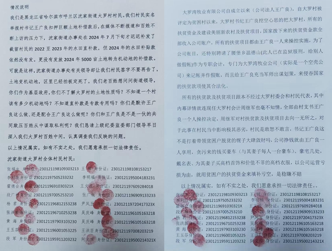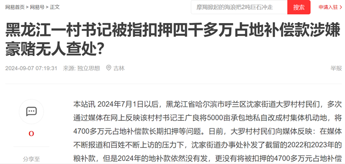 本站讯 2024年7月1日以后,黑龙江省哈尔滨市呼兰区沈家街道大罗村村民们,多次通过媒体在网上反映该村村书记王广良将5000亩承包地私自改成村集体机动地,将4700多万元占地补偿款长期扣押等问题。日前,大罗村村民们向媒体反映:在媒体不断报道和百姓不断上访的压力下,沈家街道办事处补发了截留的2022和2023年的粮补款,但是2024年的地补款依然没有发,更没有将被扣押的4700多万元占地补偿款发放到村民手中。与此同时,这位村书记扣押4700万占地补偿款和涉嫌豪赌问题至今仍无人查处。即使是这样,沈家街道办有关领导却让村民签字不要再告了。村民们说:沈家街道的领导们涉嫌严重的不作为和包庇袒护,他们表示,要继续向上级纪检监察等部门反映问题,一定要让王广良和他背后的保护伞们受到应有的惩罚。