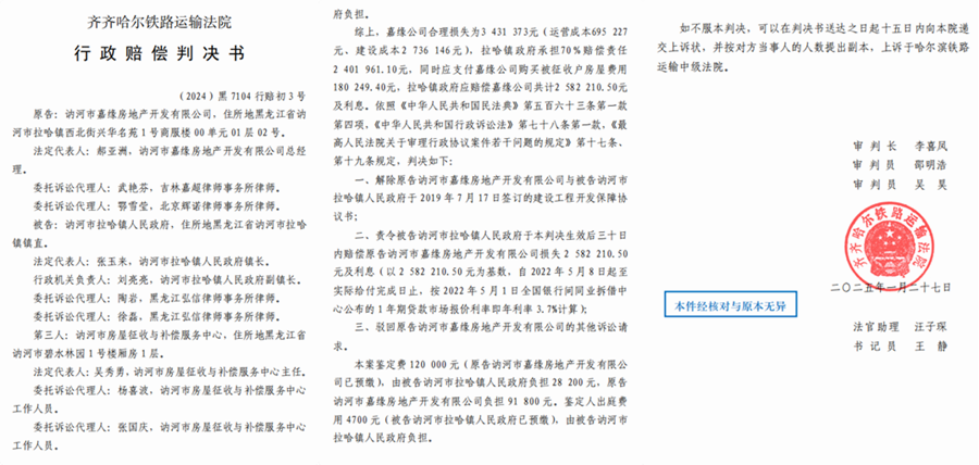 嘉缘公司认为,拉哈镇政府单方面终止协议的行政行为违法,将其告上法庭。随后,齐齐哈尔铁路运输法院经开庭审理,做出(2022)黑7104行初280号行政判决书,判决拉哈镇政府于2022年6月23日作出的拉政函[2022]48号《关于终止和解除建设工程开发保障协议书的决定》行政行为违法。拉哈镇政府上诉后,二审法院再次确认拉哈镇政府违法,维持原判。